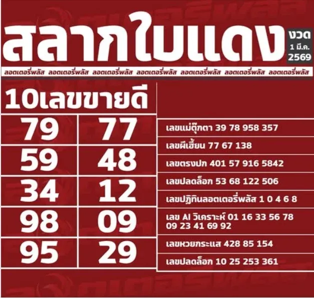 10 เลขขายดี "สลากใบแดง" งวดวันที่ 1 มีนาคม 69 พรุ่งนี้รวย รีบซื้อหวยด่วน!!