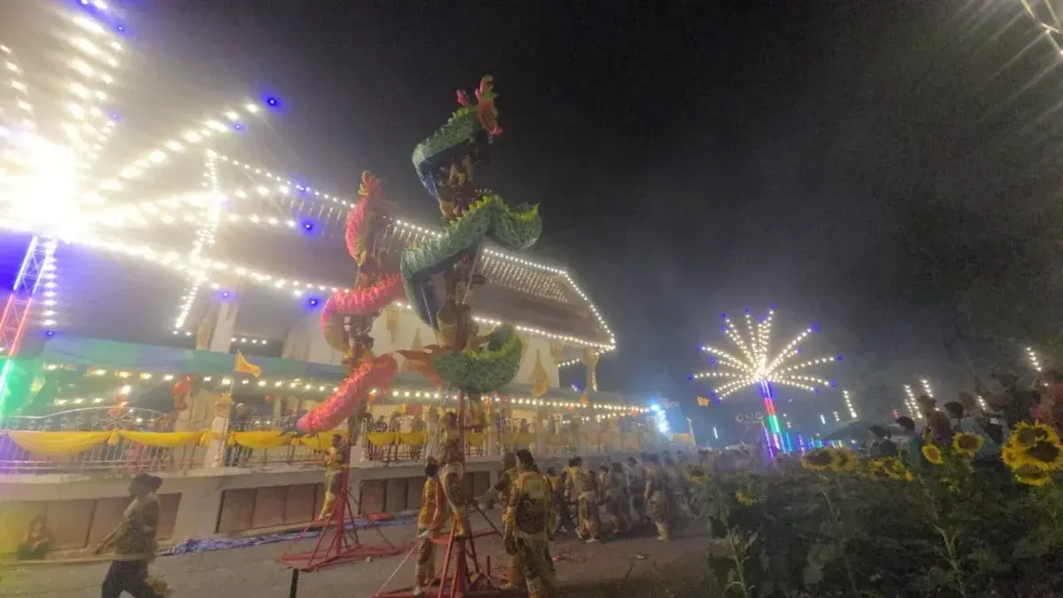 การแสดงสุดตระการตา: คณะมังกรทองและสิงโต "เอ ลายไทย" ใช้ผู้แสดงกว่า 100 ชีวิต โชว์กายกรรมพันเสาสูง 30 เมตรและพ่นไฟประกอบแสงสีเสียง เพื่อเฉลิมฉลองงานบุญมอบลูกนิมิตให้วัดยากจน 9 จังหวัด และเปิดให้ประชาชนได้ลอดท้องมังกรเพื่อความเป็นสิริมงคลตามความเชื่อ