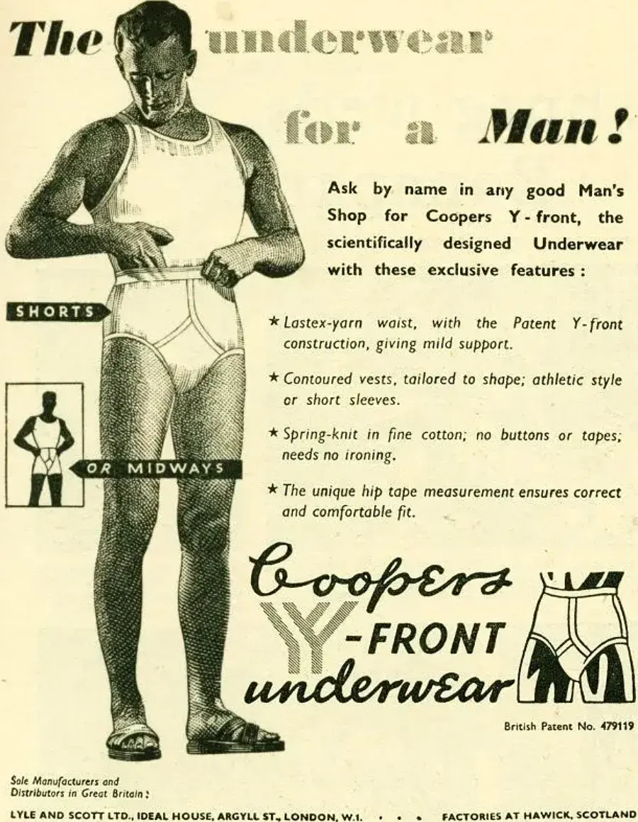 3. จุดกำเนิดจาก "ชุดว่ายน้ำ" ในปี 1934 Arthur Kneibler นักออกแบบของบริษัท Coopers Inc. (ปัจจุบันคือ Jockey) ได้รับโปสการ์ดจากเพื่อนที่ไปเที่ยว Riviera ประเทศฝรั่งเศส ในภาพนั้นเห็นผู้ชายใส่ชุดว่ายน้ำทรงรัดรูปรูปตัว "Y" * เขาเกิดไอเดียว่า "ถ้าชุดว่ายน้ำทำได้ กางเกงในก็ต้องทำได้"