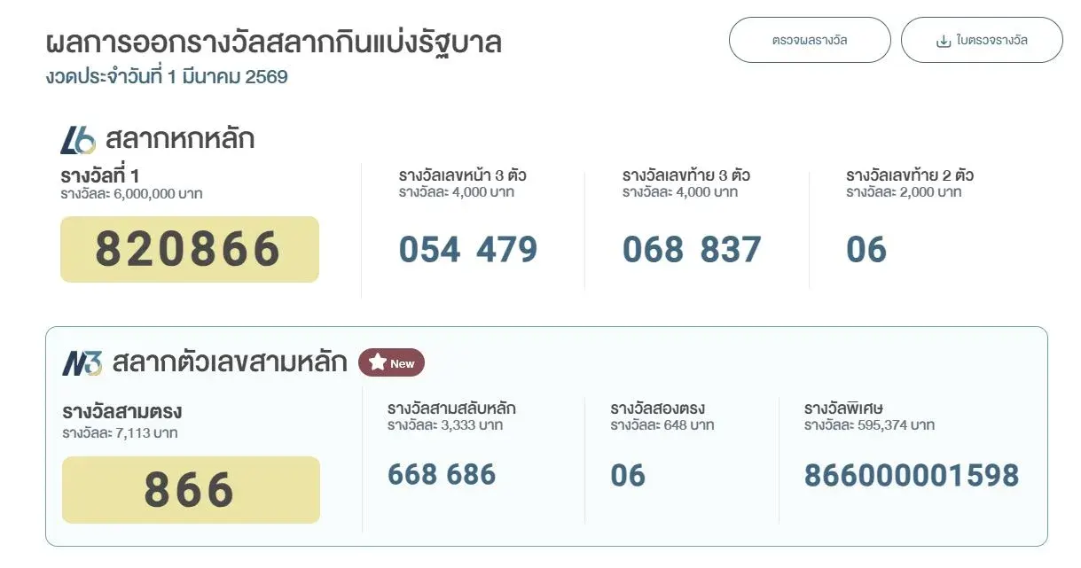 ผลการออกรางวัล สลากตัวเลขสามหลัก N3 งวดประจำวันที่ 1 มีนาคม 2569