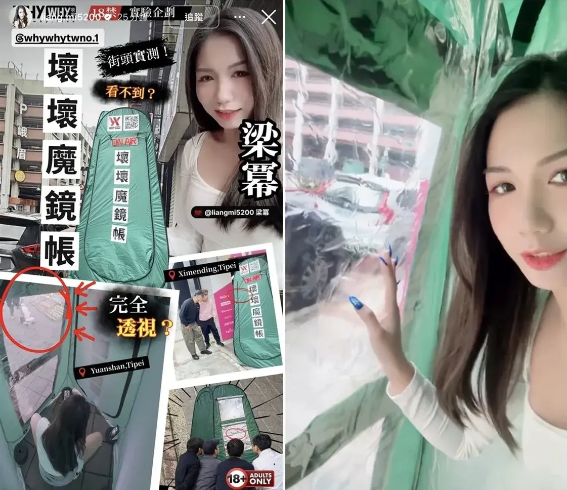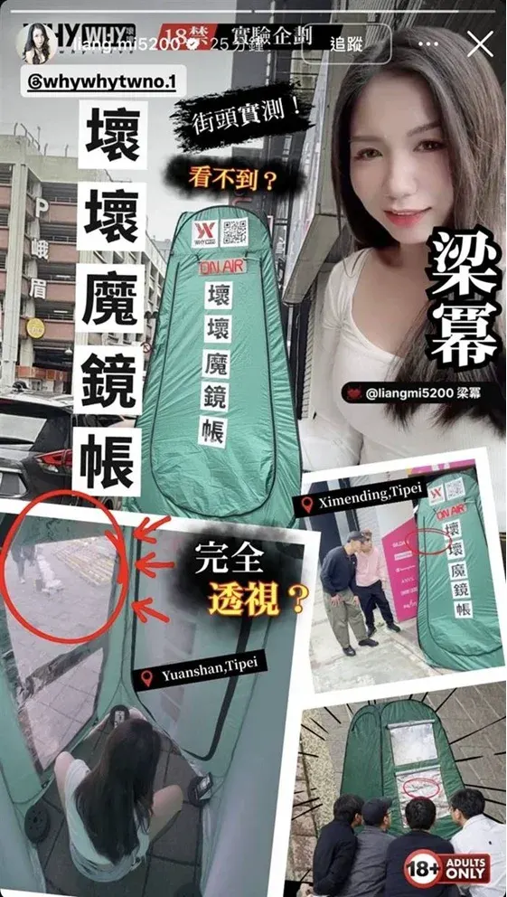 ไม่กี่วันมานี้บนโซเชียลมีเดียของไต้หวันก็มีกระแสการแชร์ภาพเต้นท์ปริศนาที่จู่ๆ ก็โผล่มาอยู่บนถนนในย่านซีเหมินติง แหล่งช้อปปิ้งชื่อดังใจกลางกรุงไทเป เมื่อวันที่ 4 มีนาคม ที่ผ่านมา จนกลายเป็นประเด็นที่ทำเอาหลายคนสงสัย โดยเฉพาะอย่างยิ่งเมื่อพบว่ามีสาวเซ็กซี่เข้า ๆ ออกๆ จากเต็นท์นี้ ทำเอาบางคนถึงกับคอมเมนต์ถามด้วยว่า "ใช่อย่างที่คิดไหม ?" และ "มีถ่ายหนังกันเหรอ ?" ทั้งนี้ก็มีชาวเน็ตบางรายได้ตั้งข้อสังเกตว่า เต้นท์นี้ดูคล้ายกับโปรเจกต์หนังผู้ใหญ่ในญี่ปุ่นอย่าง Magic Mirror Tent ดังนั้นอาจจะเป็นไปได้ว่าเต็นท์ปริศนาที่ตั้งอยู่ในซีเหมินติง แท้จริงแล้วก็คือ Magic Mirror Tent เวอร์ชันไต้หวันแน่ๆ