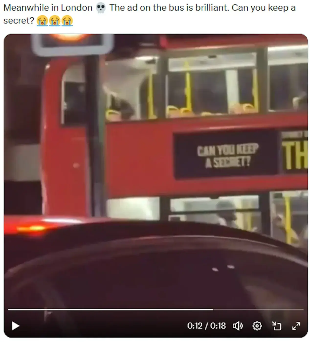 สิ่งที่ทำให้ข่าวนี้กลายเป็นไวรัลหนักกว่าเดิม คือความช่างสังเกตของชาวเน็ตที่มองเห็นข้อความโฆษณาขนาดใหญ่ข้างตัวรถบัส ซึ่งเขียนไว้ว่า “CAN YOU KEEP A SECRET?” (คุณช่วยเก็บความลับได้ไหม?) ประโยคนี้กลายเป็นที่ขบขันและถูกแชร์ต่ออย่างรวดเร็ว เพราะในขณะที่ตัวรถถามว่าเก็บความลับได้ไหม แต่ภาพที่ปรากฏอยู่บนชั้นสองกลับเป็นการเปิดเผย "ความลับ" ต่อสาธารณชนอย่างไม่มียางอาย จนหลายคนเข้ามาคอมเมนต์แซวว่า "นี่คือการตลาดที่ล้ำลึกที่สุด" หรือ "เป็นความลับที่คนทั้งลอนดอนรู้"