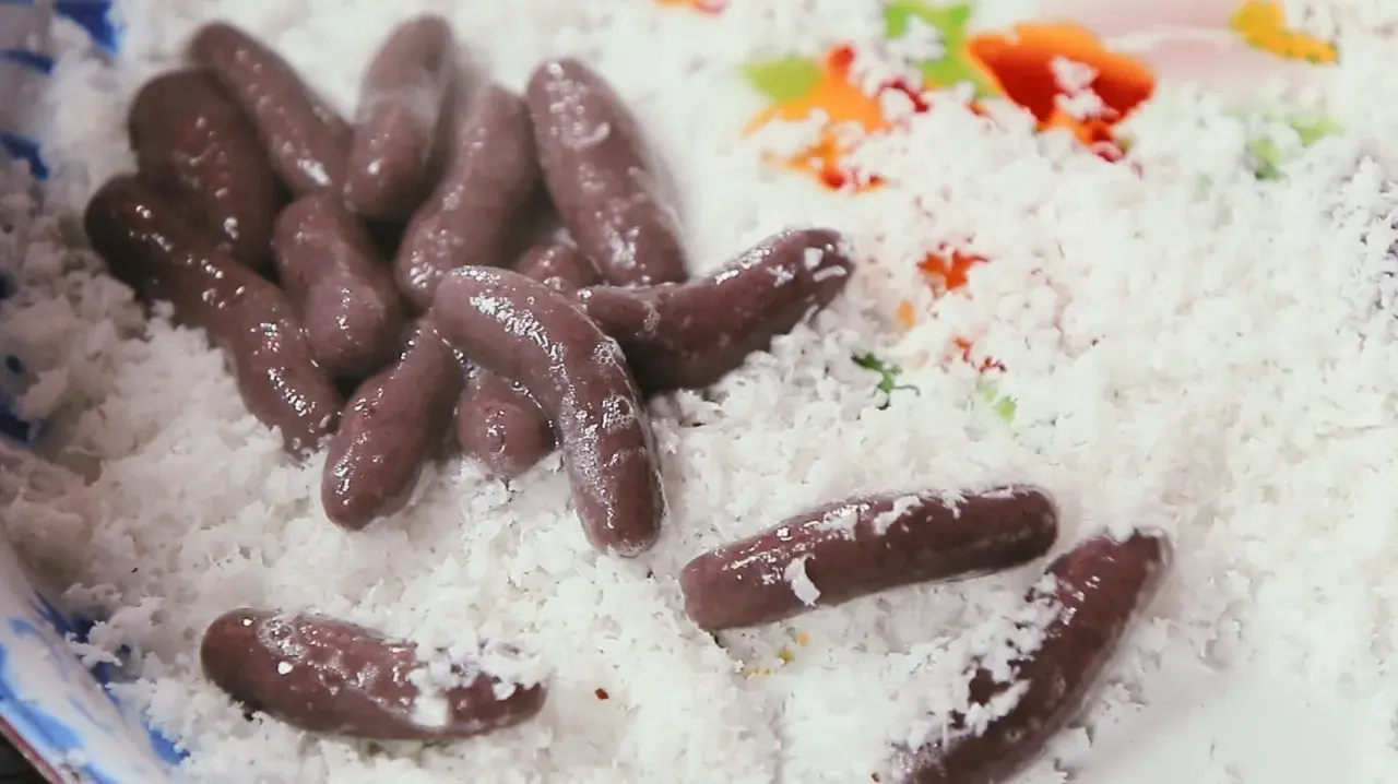 แม้ชื่อจะชวนให้คนยิ้ม แต่ตัวขนมกลับมีความละมุนแบบขนมพื้นบ้านไทยอย่างแท้จริง โดยทั่วไปทำจากแป้งข้าวเหนียวเป็นหลัก ปั้นเป็นแท่งยาวขนาดพอดีคำ แล้วนำไปต้มจนสุก ก่อนคลุกหรือโรยด้วยมะพร้าวขูดฝอย งาดำ และน้ำตาล ทำให้ได้รสสัมผัสนุ่มหนึบ หอมมะพร้าว และมีความหวานมันแบบเรียบง่าย บางสูตรร่วมสมัยมีการปรับส่วนผสมเพิ่มกะทิ มันม่วง หรือสีจากวัตถุดิบธรรมชาติ เพื่อให้หน้าตาดูน่าสนใจขึ้น แต่แก่นของขนมก็ยังคงเป็นขนมแป้งพื้นบ้านที่กินอร่อยแบบไม่ซับซ้อน