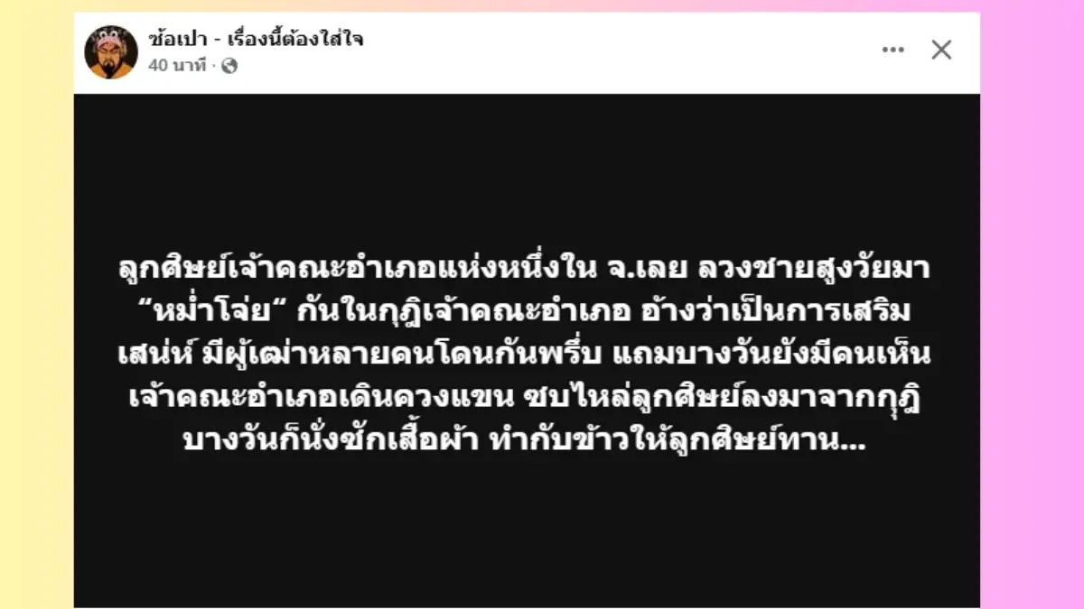 วงการสงฆ์จังหวัดเลยต้องสั่นคลอนอีกครั้ง เมื่อมีกระแสข่าวอื้อฉาวเกี่ยวกับการทำพิธีไสยศาสตร์ที่ผิดหลักศาสนาและศีลธรรมภายในวัดป่าชื่อดัง โดยลูกศิษย์คนสนิทของเจ้าอาวาสถูกกล่าวหาว่าเรียกผู้สูงอายุมาทำพิธีประหลาดในกุฏิ จนนำไปสู่การกดดันจากชาวบ้านและลงเอยด้วยการประกาศลาออกจากตำแหน่งการปกครองสงฆ์ทั้งหมดของเจ้าอาวาสเพื่อรับผิดชอบต่อเหตุการณ์ที่เกิดขึ้น