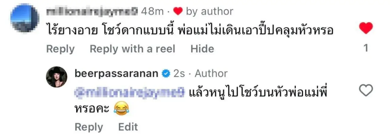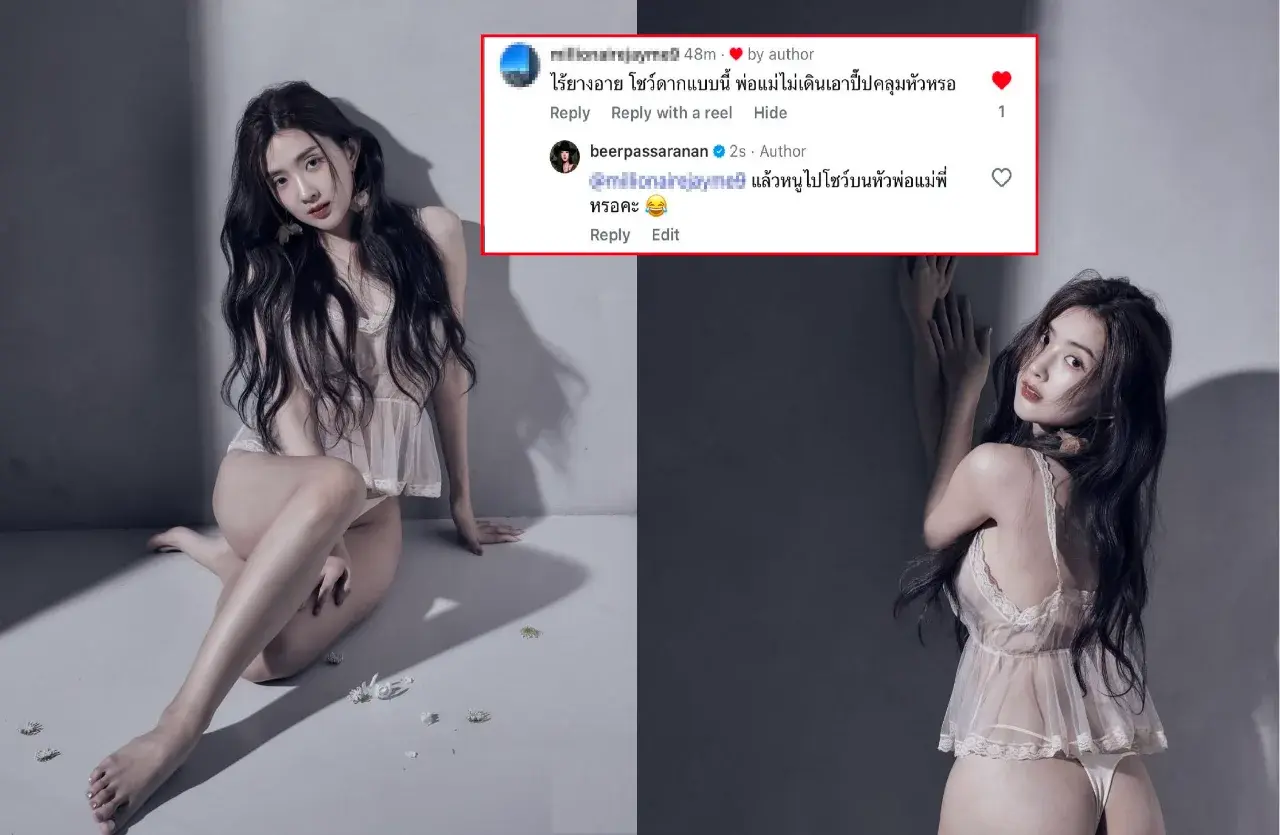 งานนี้ สาวเบียร์ เธอก็ไม่อยู่เฉยรีบสวนกลับทันที ตอกกลับแบบนิ่มๆ แต่เจ็บลึกถึงทรวงชนิดที่เรียกว่าคนอ่านยังหงายหลัง โดยเธอบอกว่า "แล้วหนูไปโชว์บนหัวพ่อแม่พี่เหรอคะ” บอกเลยประโยคเดียวสั้นๆ แต่ทำเอาคอมเมนต์นั้นถึงกับเงียบกริบ กลายเป็นแมตช์หยุดโลกไปในทันที เรียกว่าฟาดมาฟาดกลับแบบไม่โกง ทั้งนี้แม้จะมีเสียงวิจารณ์อยู่บ้าง แต่กระแสส่วนใหญ่กลับเชียร์อัปให้ สาวเบียร์ โดยมองว่ายุคนี้แล้วเรามีสิทธิ์จะโชว์อะไรก็ได้ บอกเลยเล่นกับใครไม่เล่นดันมาเล่นกับตัวแม่สายฟาดเข้าให้ อย่ามาลุกลามถึงบุพการี อันนี้รับไม่ได้ทนไม่ใหวจริงๆ ถ้าไม่ชอบก็อย่ามาใส่ใจ ผ่านไปได้เลย เพราะถ้าใส่ใจมากๆ จะมีทนายร่อนหมายศาลไปถีงหน้าบ้านน่ะ จะเมนต์อะไรก็ระวังตัวกันนิดนึงตอนนี้ตัวแม่เริ่มองค์ลงแล้ว