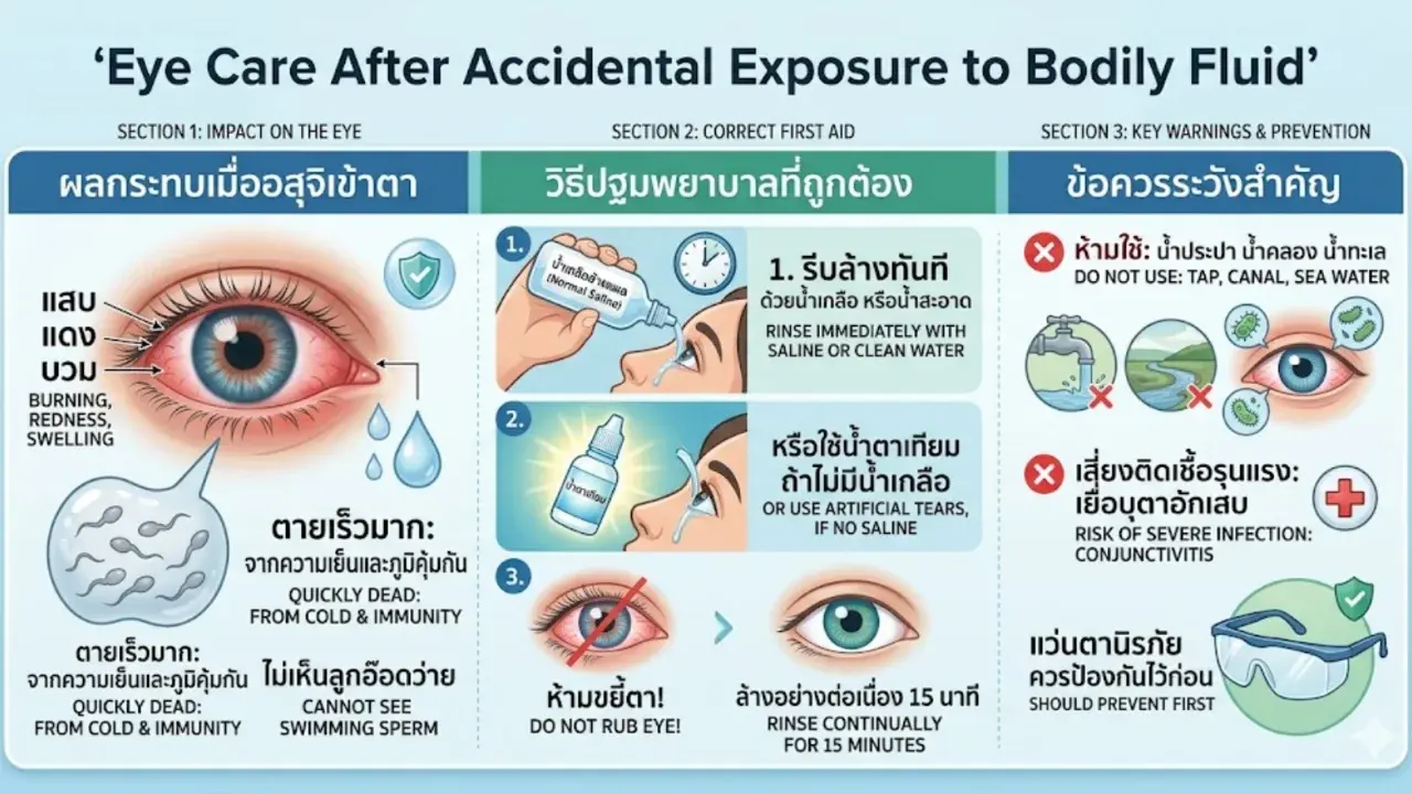 ดวงตาเป็นอวัยวะที่ละเอียดอ่อนและบอบบางเกินกว่าจะรับแรงกระแทกจากสิ่งแปลกปลอมทุกชนิด แม้อสุจิจะมีขนาดเล็กจนมองไม่เห็นด้วยตาเปล่า แต่ส่วนประกอบทางเคมีของมันสามารถสร้างความเสียหายรุนแรงได้ในเวลาอันรวดเร็ว การตั้งสติและล้างตาด้วยน้ำเกลือที่สะอาดคือวิธีป้องกันที่ดีที่สุด และควรพึงระลึกเสมอว่าความปลอดภัยของดวงตาควรมาเป็นอันดับแรกในทุกกิจกรรม
