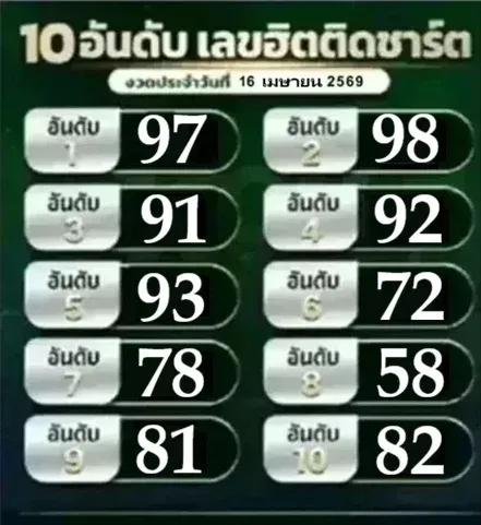 มาแล้ว! "10 อันดับ เลขฮิตติดชาร์ต" งวดวันที่ 16 เมษายน 69..เลขไหนฮิต ส่องเลย!
