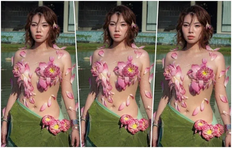 โดยในภาพนี้ เธอมาในคอนเซปต์ My Lotus มีการสวมใส่กระโปรงที่ทำมาจากใบบัวสีเขียวขจีสดใส แต่ที่ทำเอาหลายคนหลุดโฟกัสก็คือท่อนบนที่เปลือยเปล่าไร้เสื้อผ้ามีเพียงกลีบดอกบัวสีชมพูที่นำมาประดับตกแต่งปกปิดหน้าอกหน้าใจอย่างมีศิลปะ พร้อมกับมีการแต่งหน้าที่เน้นความฉ่ำวาว อวดผิวขาวสุขภาพดีมีออร่าท่ามกลางบรรยากาศริมสระบัวที่ดูสวยงาม
