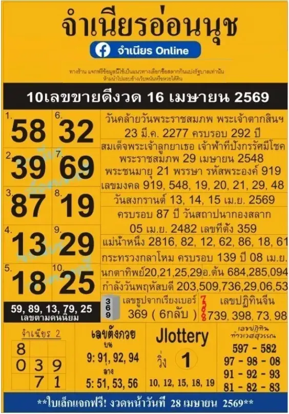 10 เลขขายดี "จำเนียรอ่อนนุช" งวดวันที่ 16 เมษายน 69 มาแล้ว!..คอหวยส่องด่วน!!