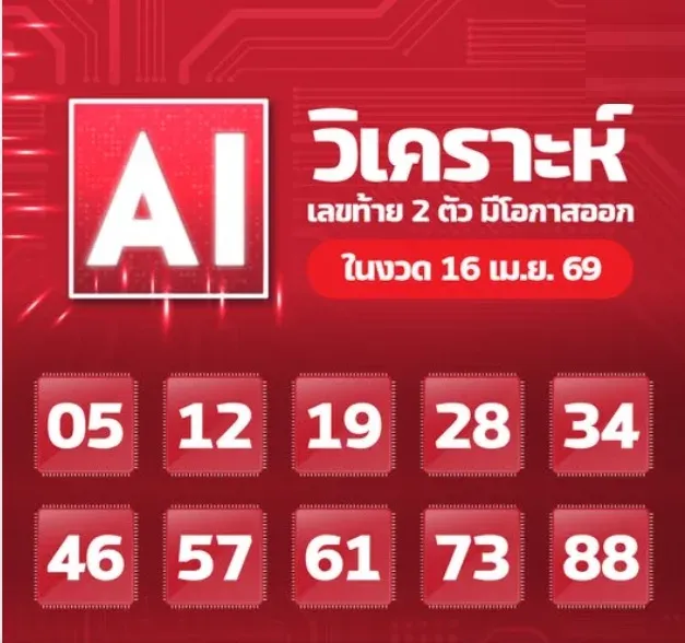 AI วิเคราะห์เลขท้าย 2 ตัว งวดวันที่ 16 เมษายน 69..โดยใช้สถิติย้อนหลัง 20 ปี ใกล้โค้งสุดท้ายแล้วเหลือเวลาอีกเพียงไม่กี่วันหวยก็ใกล้จะออก เชื่อว่าหลายๆ คนคงยังไม่มีเลขเด็ดโดนใจ หรือไม่มีลอตเตอรี่ติดกระเป๋าเอาไว้เลยสักใบ วันนี้เราจึงมีแนวทางใหม่ๆ ให้ได้ลองกันดู นั่นก็คือ การวิเคราะห์เลขท้าย 2 ตัวที่จะออกในงวดนี้ โดยอาศัยเทคโนโลยีระบบปัญญาประดิษฐ์ หรือ AI ให้มาช่วยในการคำนวณและวิเคราะห์ความน่าจะเป็นของการออกสลากกินแบ่งรัฐบาล ทั้งนี้ก็อาศัยข้อมูลสถิติการออกสลากกินแบ่งย้อนหลังไป 20 ปี ตั้งแต่ปี พศ.2548 - 2568 เพื่อสรุป 10 เลขท้าย 2 ตัวที่มีโอกาสจะออกในงวดวันที่ 16 เมษายน พ.ศ.2569 มากที่สุด ซึ่งก็ได้เลขเด็ดดังนี้