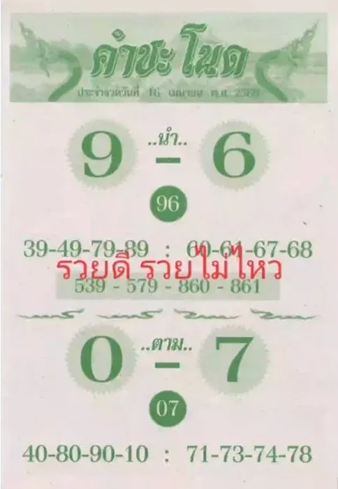 อย่างไรก็ดี เลขเด็ดทั้งหมดนี้ก็เป็นเพียงแค่แนวทางเท่านั้น นักเสี่ยงโชคทุกท่านได้โปรดใช้วิจารณญาณในการตัดสินใจซื้อหวยกันด้วย เพราะการเสี่ยงโชคก็ย่อมจะมีความเสี่ยงตามมาเสมอ สุดท้ายนี้ก็ขอให้ทุกท่านโชคดีร่ำรวยถูกหวยตลอดไป