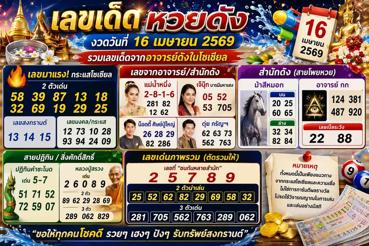 #หวย16เมษายน2569 #เลขเด็ด #หวยดัง #หวยโซเชียล #สายมู #แม่น้ำหนึ่ง #เจ๊นุ๊ก #ม้าสีหมอก #คำชะโนด #หวยงวดนี้