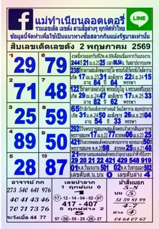 10 เลขเด็ดเลขดัง "แม่ทำเนียนลอตเตอรี่" งวดวันที่ 2 พฤษภาคม 69..คอหวยอย่าพลาด!!