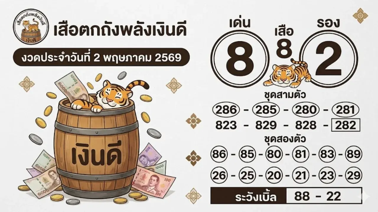 เปิดกรุเลขเด็ด! "เสือตกถังพลังเงินดี" งวด 2 พฤษภาคม 2569 ขนทัพเลขเด่น-รอง ลุ้นรวยยกถัง
