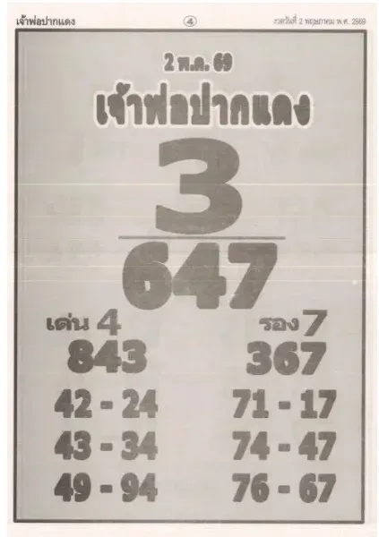 เลขเด็ด เจ้าพ่อปากแดง งวดวันที่ 02/05/69 นี้ก็ได้ปล่อยทั้งเลขเด่น เลขดัง มาให้บรรดาคอหวยได้ไปพิจารณากันเอาเอง สำหรับใช้เป็นแนวทางในการเสี่ยงโชคซื้อลอตเตอรี่ โดยงวดนี้มีเลขเด่น คือ 4 และรอง คือ 7 ส่วนตัวเลขในชุดอื่น ๆ ก็มีความน่าสนใจเป็นอย่างมาก สามารถตามไปดูที่ใบหวยด้านล่างกระทู้กันได้เลย