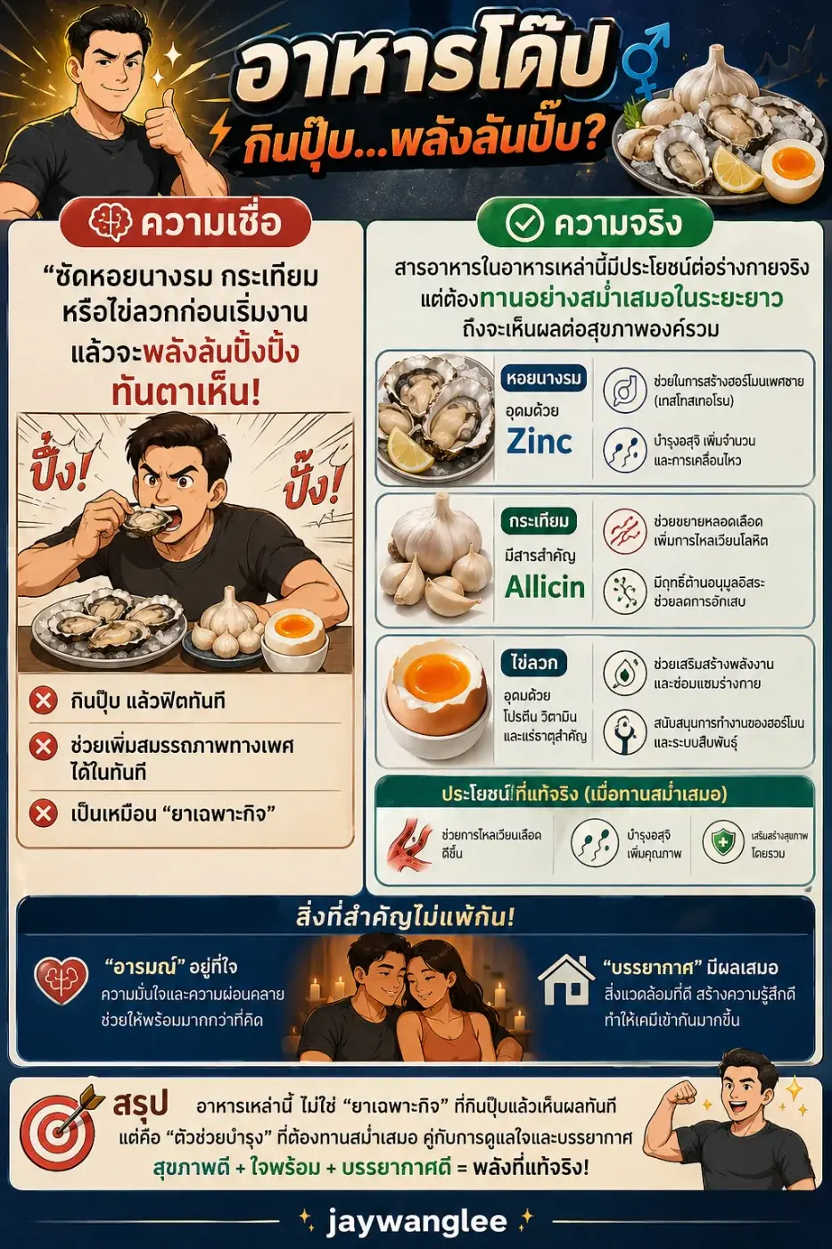 ความจริง: สารอาหารอย่าง Zinc หรือ Allicin มีส่วนช่วยเรื่องการไหลเวียนเลือดและบำรุงอสุจิก็จริง แต่ต้องทานสม่ำเสมอในระยะยาวถึงจะเห็นผลต่อสุขภาพองค์รวมครับ การทานปุ๊บปั๊บไม่ได้ให้ผลเหมือน "ยาเฉพาะกิจ" อย่างที่เข้าใจกัน ของพวกนี้ช่วยเรื่อง "สุขภาพ" แต่ "อารมณ์" อยู่ที่ใจและบรรยากาศล้วนๆ