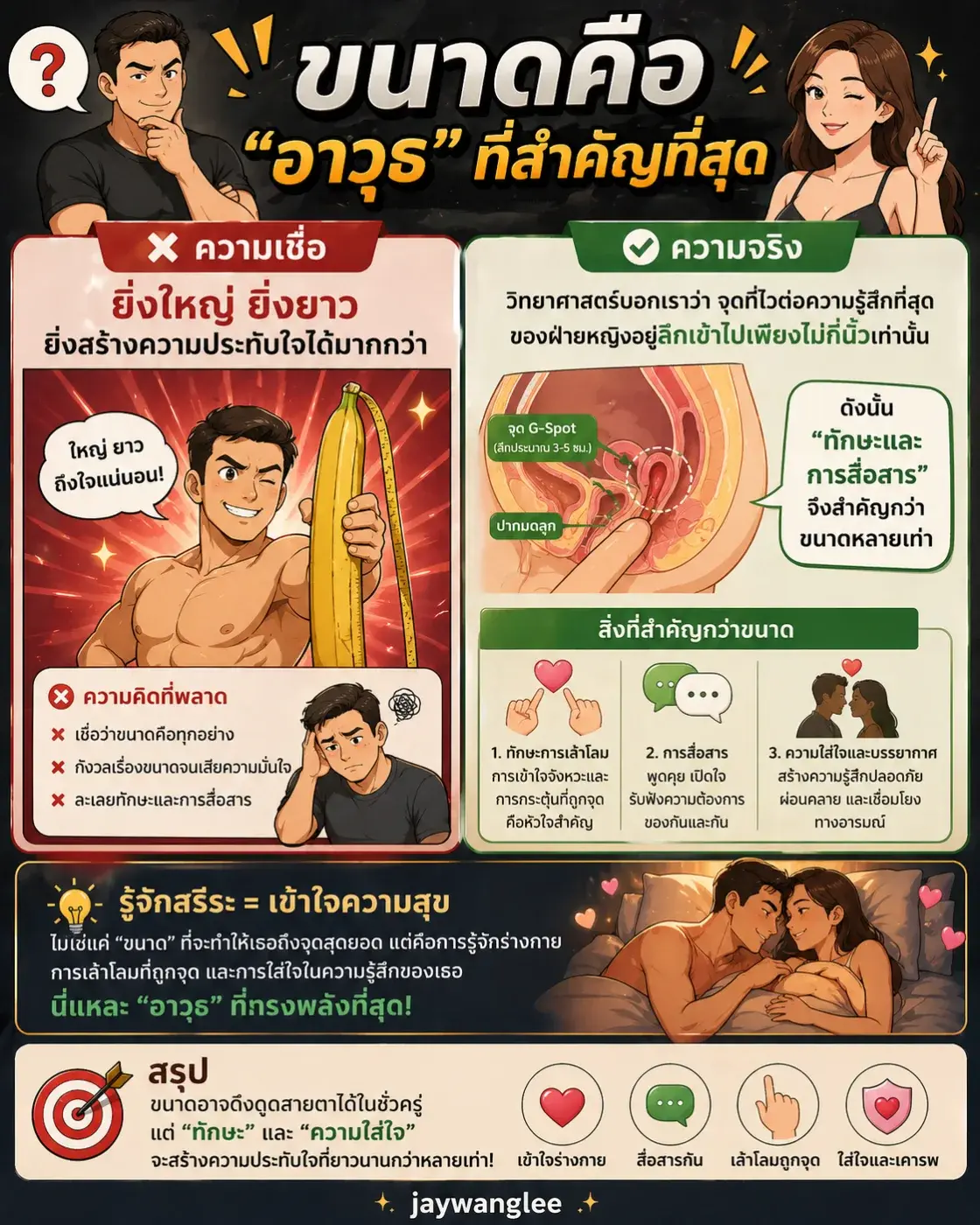 ความจริง: วิทยาศาสตร์บอกเราว่า จุดที่ไวต่อความรู้สึกที่สุดของฝ่ายหญิงอยู่ลึกเข้าไปเพียงไม่กี่นิ้วเท่านั้น ดังนั้น "ทักษะและการสื่อสาร" จึงสำคัญกว่าขนาดหลายเท่า การรู้จักสรีระและการเล้าโลมที่ถูกจุดคือหัวใจสำคัญที่แท้จริง