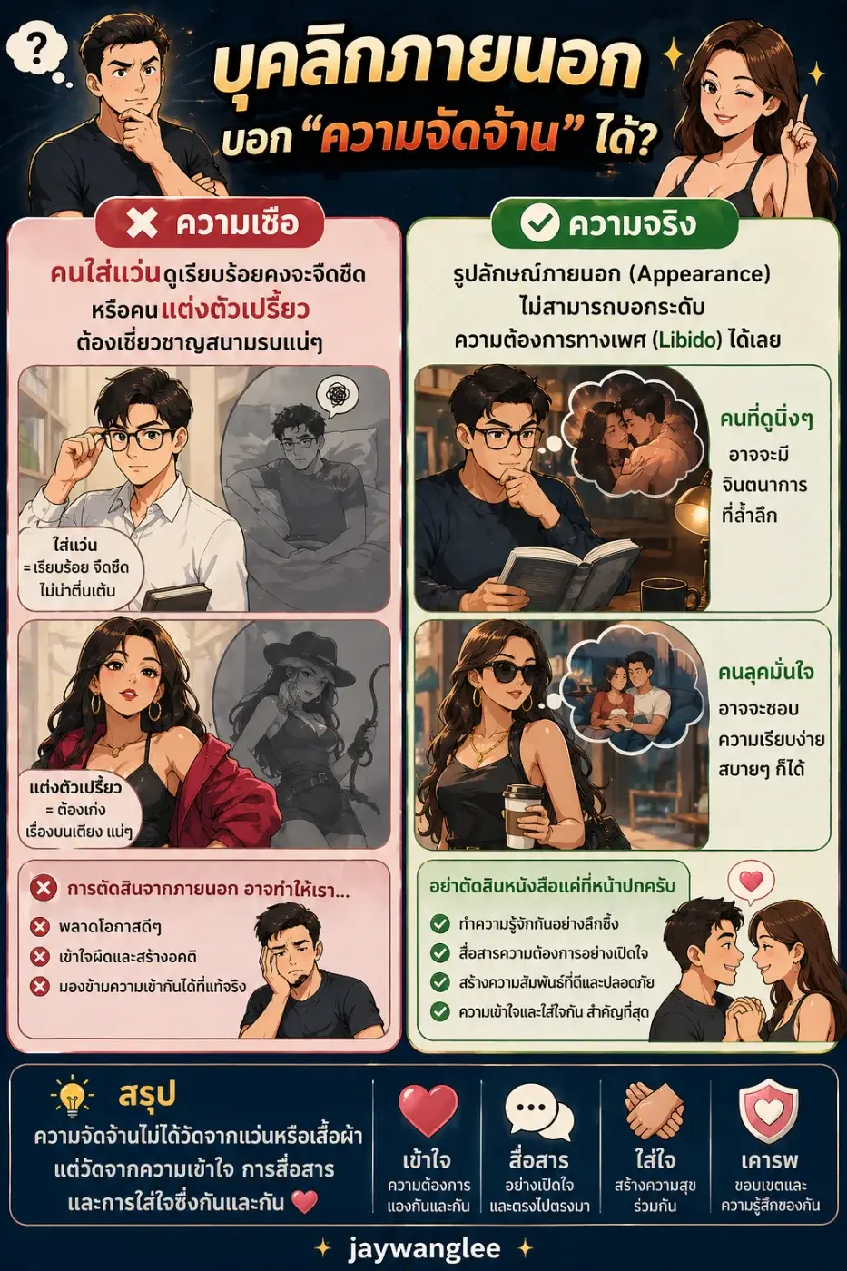 ความจริง: รูปลักษณ์ภายนอก (Appearance) ไม่สามารถบอกระดับความต้องการทางเพศ (Libido) ได้เลย คนที่ดูนิ่งๆ อาจจะมีจินตนาการที่ล้ำลึก ในขณะที่คนลุคมั่นใจอาจจะชอบความเรียบง่ายสบายๆ ก็ได้ อย่าตัดสินหนังสือแค่ที่หน้าปกครับ