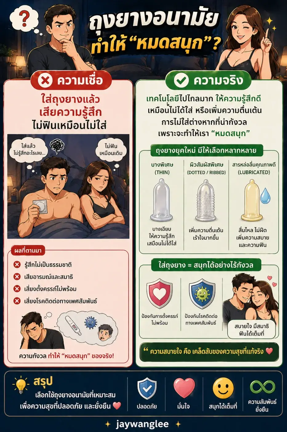 ความจริง: ปัจจุบันเทคโนโลยีการผลิตไปไกลมาก มีแบบบางพิเศษที่ให้ความรู้สึกเหมือนไม่ได้ใส่ หรือแบบที่มีผิวสัมผัสช่วยเพิ่มความตื่นเต้น การไม่ใส่ต่างหากที่น่ากังวล เพราะความกังวลเรื่องการตั้งครรภ์หรือโรคติดต่อจะทำให้เรา "หมดสนุก" ของจริง