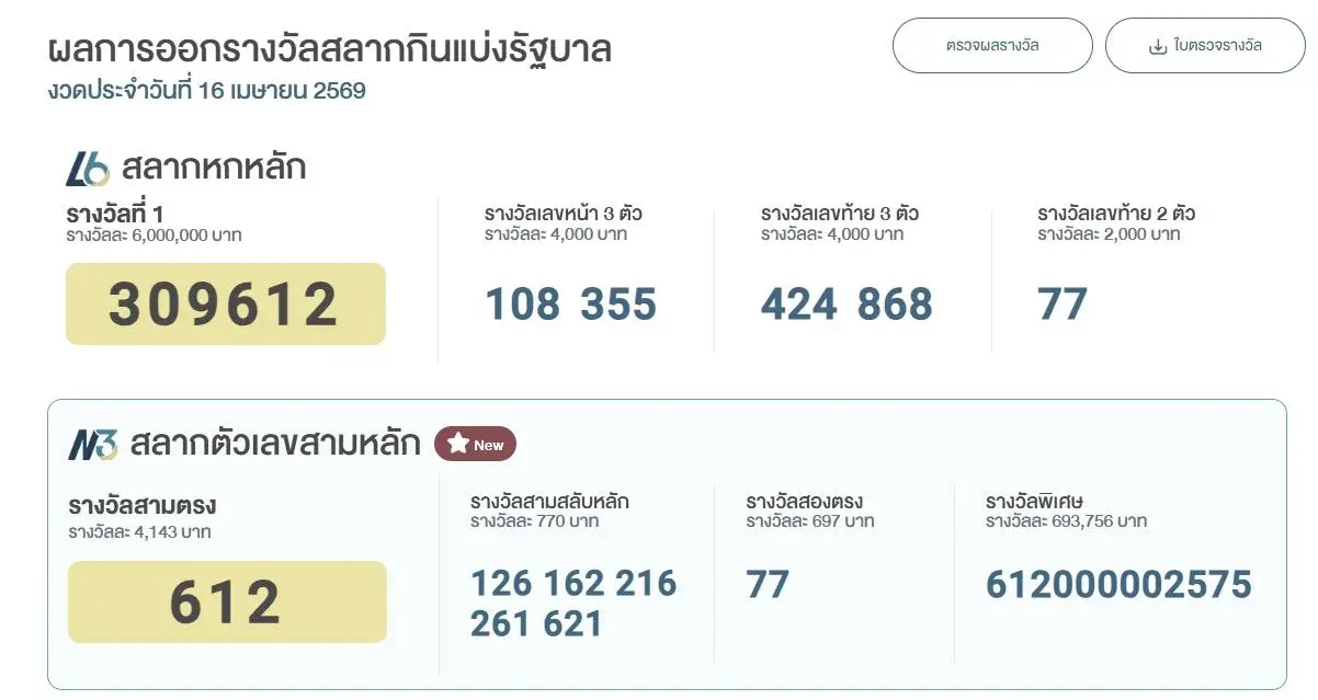 ผลการออกรางวัล สลากตัวเลขสามหลัก N3 งวดประจำวันที่ 16 เมษายน 2569