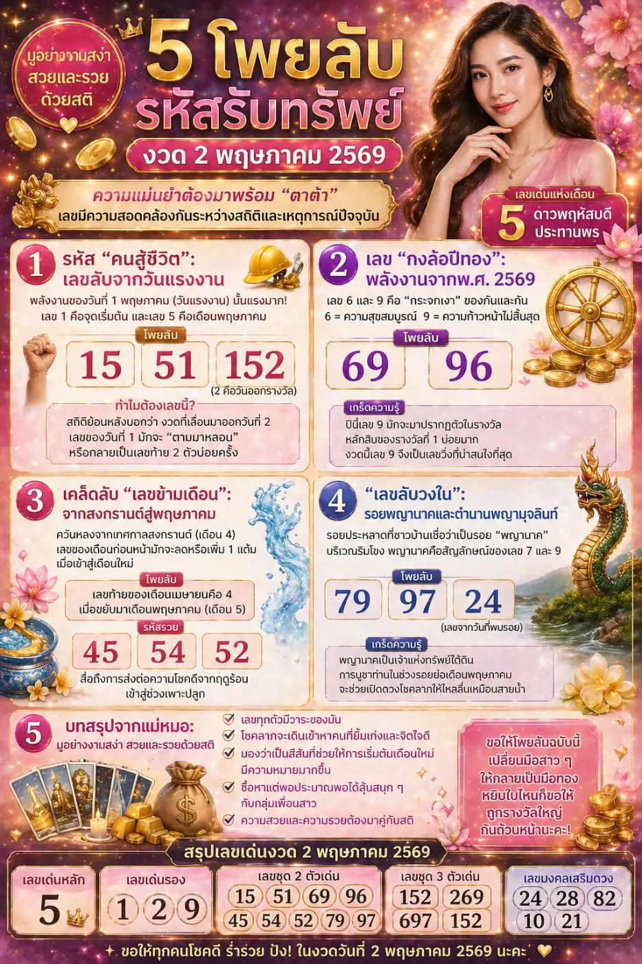 การเสี่ยงโชคในงวดวันที่ 2 พฤษภาคม 2569 นี้ ขอให้มองว่าเป็นสีสันที่ช่วยให้การเริ่มต้นเดือนใหม่มีความหมายมากขึ้น ซื้อหาแต่พอประมาณพอได้ลุ้นสนุก ๆ กับกลุ่มเพื่อนสาวนะคะ ความสวยและความรวยต้องมาคู่กับสติเสมอ ขอให้โพยลับฉบับนี้เปลี่ยนมือสาว ๆ ให้กลายเป็นมือทอง หยิบใบไหนก็ขอให้ถูกรางวัลใหญ่กันถ้วนหน้านะคะ!