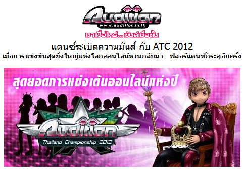 เมื่อการแข่งขันสุดยิ่งใหญ่แห่งโลกออนไลน์โคจรกลับมา ฟลอร์แดนซ์เวทีใหญ่ของวัยทีนก็ระเบิดความมันส์อีกครั้ง Audition เกมแดนซ์ออนไลน์อันดับหนึ่งจาก Playpark เปิดศึกความมันส์สเต็ปแดนซ์ ใน Audition Thailand Championship 2012 หรือ ATC 2012 สุดยอดการแข่งขันที่มันส์ขั้นเทพ ที่สุดของเกมแดนซ์ยุคนี้