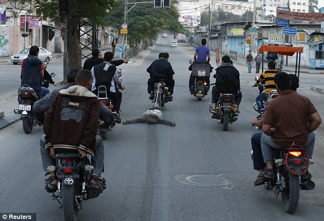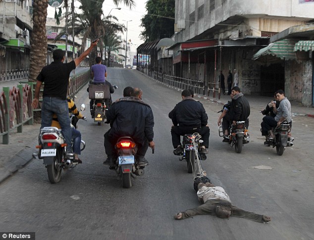 6 คนที่ถูกกล่าวหาว่าเป็นสายลับอิสราเอล ถูกบังคับให้นอนคว่ำหน้าก่อนจะถูกยิงที่ศีรษะ ท่ามกลางเสียงเชียร์ของชาวปาเลสไตน์ ศพ 1 ใน 6 ถูกผูกล่ามไว้กับรถจักรยานยนต์และถูกลากไปรอบเมืองกาซา การทำสงคราม7วันที่ผ่านมา ทำให้ชาวปาเลสไตน์เสียงชีวิตไปแล้ว 118 คน ซึ่งพลเรือนมากกว่าครึ่งเป็นเด็กและสตรี