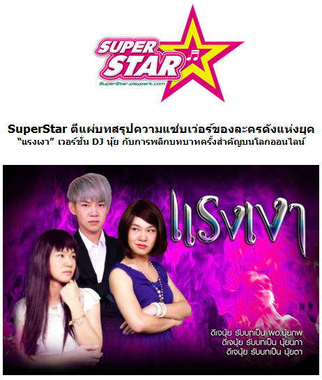 SuperStar คาราโอเกะออนไลน์ครั้งแรกของเมืองไทย จาก PlayPark ตามติดกระแส “แรงเงา” ฟีเวอร์ ละครดังที่สุดแห่งยุค ด้วยการเผยบทสรุปความแซ่บเว่อร์ที่หาดูได้เฉพาะบนโลกออนไลน์เท่านั้น กับการพลิกบทบาทครั้งสำคัญของ “นุ้ย” ดีเจแฉชื่อดัง แห่งยุคจาก คลื่น EFM ที่สวมบทบาทแบบ 3 in 1 ได้แรงถึงใจ