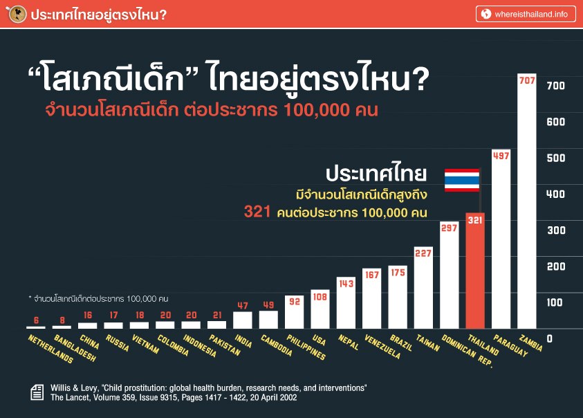 จากการศึกษาของ Willis & Levy เมื่อปี 2002 ที่ตีพิมพ์ในวารสาร The Lancet ประเทศไทยมีจำนวนโสเภณีเด็กต่อประชากรสูงมากประเทศหนึ่งในกลุ่มประเทศที่ทำ การสำรวจ (อ่านเพิ่มเติมใน [1]) โดยมีอัตราการค้าบริการทางเพศเด็กสูงถึง 321 คนต่อประชากร 100,000 คน ซึ่งสูงกว่าหลายประเทศ รวมทั้งสาธารณรัฐโดมินิกัน (297 จาก 100,000 คน) และประเทศเพื่อนบ้านของเราเช่นเวียดนามและกัมพูชา แม้จะน้อยกว่าบางประเทศ เช่น แซมเบีย (707 จาก 100,000 คน)