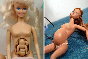ไม่น่าเชื่อว่าบริษัทผลิตตุ๊กตายักษ์ใหญ่อย่างบาร์บี้จะทำอะไรแบบนี้ด้วย! นี่คือตุ๊กตาบาร์บี้ตั้งท้อง ที่แค่ดูแบบปกติก็ประหลาดมากแล้วก็ท้องบวมเป่งแบบนี้ แต่ที่เป็นไฮไลท์เลย คือสามารถถอดส่วนท้องออกมาได้ (เป็นแค่ฝาครอบไว้) แล้วข้างในคุณก็จะได้พบกับ ลูกบาร์บี้ตัวน้อยๆที่น่ารักนอนขดอยู่ในท้องแม่ แน่นอนว่าเอาแกะเอาลูกออกมาเล่นได้ด้วยนะ ไม่แน่ใจเหมือนกันว่าผลิตภัณฑ์นี้ผ่านของเซนเซอร์ของบริษัทมาได้อย่างไร เพราะเท่าที่ดูเป็นไอเดียที่ไม่เข้าท่าเลย เพราะนอกจากจะทำให้เด็กสับสนกับวิธีการเกิดลูกของมนุษย์แล้ว เรื่องน่ากลัวคงไม่ต้องพูดถึงว่าขนาดไหน