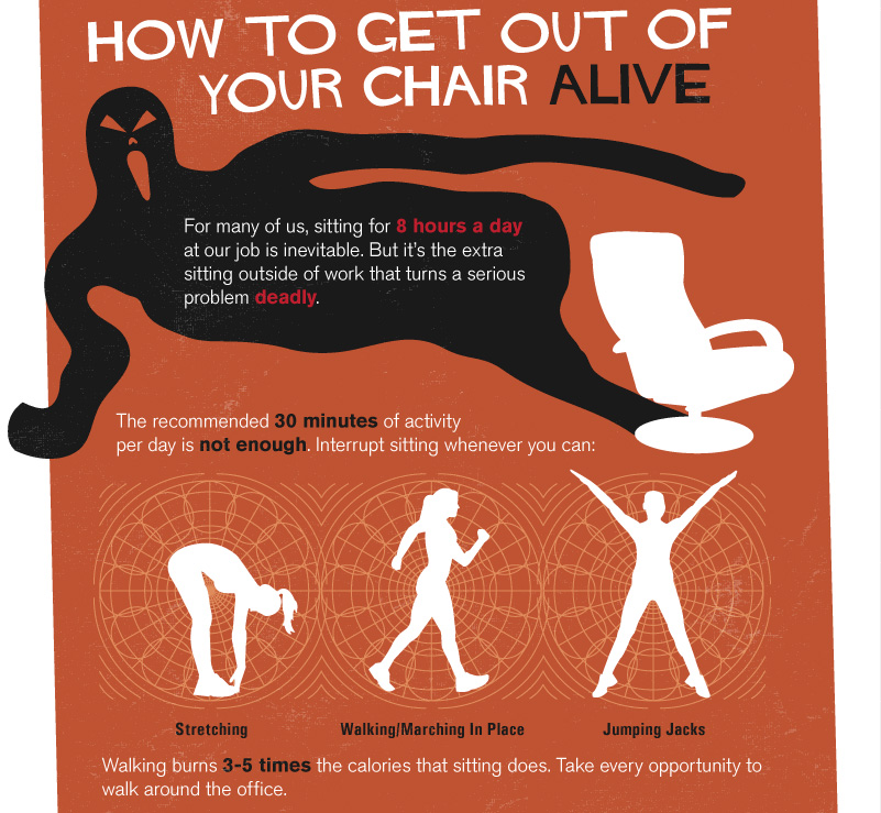 ควรเบรคบ้าง โดยการ ลุกขึ้นยืดเส้นยืดสาย เดินเล่นรอบออฟฟิศ หรือลงไปในสวนหย่อมกระโดดกางแขนขา เพื่อให้ร่างกายหลายๆส่วนได้ออกแรงบ้าง การเดินทำให้เผาผลาญมากกว่านั่งเฉยๆถึง 3-5 เท่า ถ้ามีโอกาสเดินบ้าง ก็ควรเดิน!!