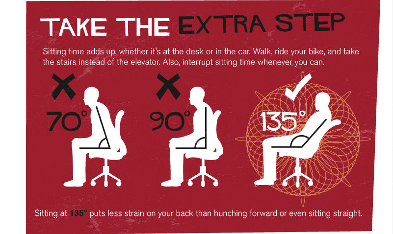 ดังนั้นเราๆท่านๆต้องหาโอกาสให้ร่างกายได้ออกแรงบ้าง เช่น เดิน ขี่จักรยาน ขึ้นบันไดแทนการใช้ลิฟท์หรือบันไดเลื่อน นอกจากนี้ การนั่งเอนหลัง 135 องศา ยังช่วยลดแรงกดดันของสันหลัง มากกว่าการนั่งชะโงกหรือ หลังตรงเป็นเวลานานๆ อีกด้วย