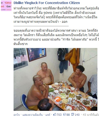 วันนี้ ( 7 ก.ค.) ผู้สื่อข่าวรายงานว่า มีการแชร์ภาพบนโลกออนไลน์จากกลุ่ม "Dislike Yingluck For Concentration Citizen" ขณะที่ภิกษุสงฆ์ตั้งวงสังสรรค์กับเพื่อนฝูงโดยบนโต๊ะและมีอาหารมากมายเกินกิจของสงฆ์ พร้อมแสดงความเห็นว่า " ท่านทั้งหลายจำไว้นะ พระที่มีสมาธิแท้จริงไม่วอกแวกมีแค่รูปเดียวเท่านั้นในโลกใบนี้ คือ รูปพระ (เพราะไม่มีชีวิต สิ่งเร้ายั่วยวนแค่ไหนก็มิอาจสะกดจิตได้) พระที่ดีที่สุดคือพระแม่ที่ให้กำเนิดชีวิตเรามาจงบูชาท่านทุกลมหายใจเข้า - ออก ขอบคุณที่เอาความชั่วชาติของพวกมารศาสนา มาแฉ ใครที่ยังงมงาย ไม่เลิกรา ก็ตื่นเสียทีเถิด และเลิกตกเป็นเหยื่อโง่ๆ ให้โล้นพวกนี้มันหัวเราะเยาะ และมาช่วยกัน" กำจัด โล้นมหาภัย พวกนี้ ให้มันสิ้นซาก" จนเป็นที่วิจารณ์เป็นอย่างมากถึงความเหมาะสม? ว่าภิกษุสงฆ์สมควรมีพฤติกรรมแบบนี้หรือไม่ เนื่องจากนักบวชต้องรู้จักใช้ชีวิตอย่างสมถะ