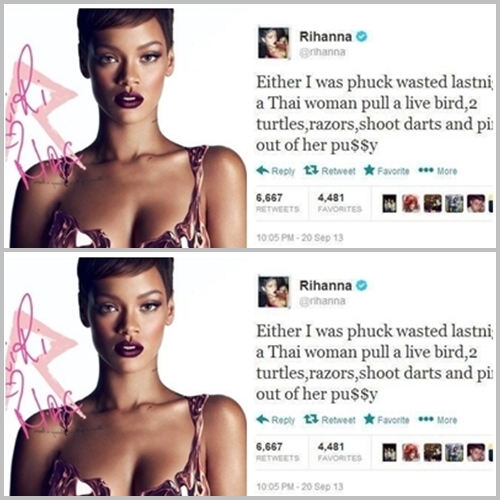 มีรายงานข่าวแจ้งว่า ในทวิตเตอร์ @Robyn Rihanna Fenty ของนักร้องสาวชาวอเมริกันชื่อดัง รีฮันน่า ได้มีข้อความโพสต์ถึงประเทศไทย หลังเธอได้เข้ามาพักผ่อนใน จ.ภูเก็ต ระหว่างทัวร์คอนเสิร์ตในประเทศแถบเอเชียตะวันออกเชียงใต้