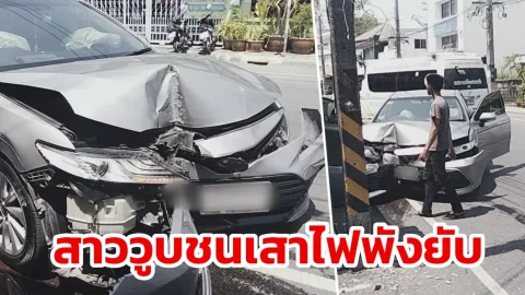 กล้องชัด! เก๋งสาววูบชนเสาไฟพังยับ คนขับเจ็บ