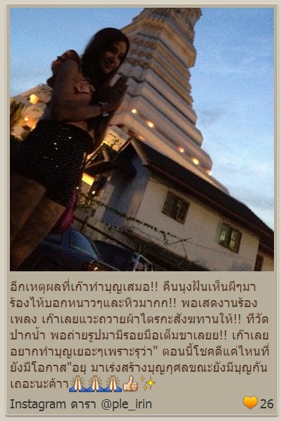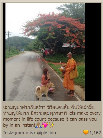ปล. 1.บางคนอาจสงสัยว่าเวลาใส่บาตร ทำไมเปิ้ลถึงมีภาพเก็บมาด้วย เธอให้คำตอบว่า เด็กวัดจะเป็นคนถ่ายให้