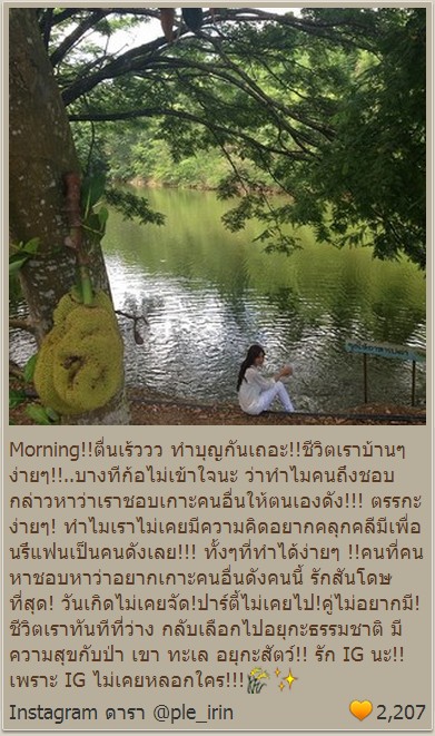 2. การที่ได้ส่องไอจีสาวเปิ้ล ทำให้เราเปลี่ยนทัศนคติในการมองคน แรกๆ จขกท.ยอมรับว่าไม่ชื่นชอบในตัวเปิ้ล เพราะดูเธอเหมือนสาวแรด (ฮ่าๆๆๆแรงไปแต่คิดแบบนั้นจริงๆ) แต่พอได้ดูไอจีนาง สอนให้เรารู้ว่า "การดูคนอย่าดูที่ภายนอก แต่จงมองให้ลึก" และคิดว่าหลายคนคงคิดเหมือน จขกท.เช่นกัน