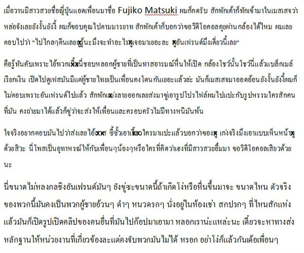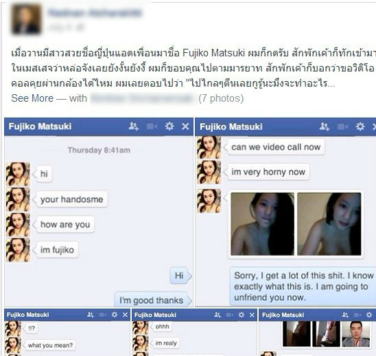 Yesterday morning a girl with FB name Fujiko Matsuki added me as a friend. As soon as I accepted her request, she greeted me in a chat message. After a few polite greeting lines she asked me if we could have a VDO call. I told her straight away that I was going to unfriend her now because I knew exactly what this was. It was a scam to get me to strip so she could blackmail me later with the recordings. A few lines of pleading after she showed her true colors by sending me a photo of me with a photo of some guy's penis and threatening messages. So I posted this to educate my friends to never fall for this kind of trick. Even when I was smart and quickly realised what this was even before anything took place, I was threatened. Well, I dare that person to show me a photo of my penis with my face attached hahaha. Listen, friends, there is no such luck as a beautiful sexy girl feeling horny and want to have a naked VDO chat with you. They are probably some fat blokes with dirty beards sitting in front of a computer in a shabby rented room somewhere playing a prepared VDO clip or photos copied from somewhere to trick you for money. Don't ever fall for this shit.