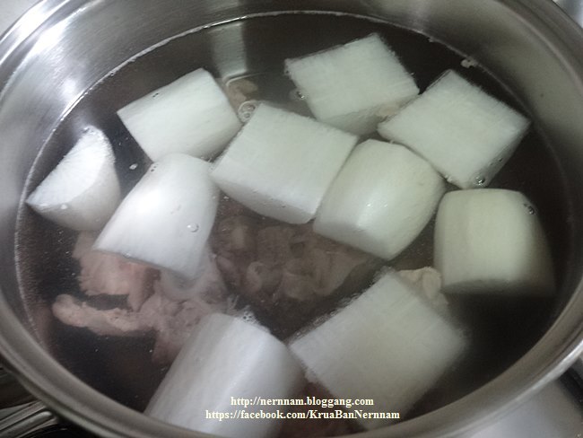 ก่อนอื่นเราต้องเตรียมน้ำซุปก่อนค่ะ ต้มน้ำให้เดือด ใส่ซี่โครงลงต้มจนหมดเลือด แล้วตักขึ้นพักไว้ เทน้ำทิ้ง ทำเช่นนี้เพื่อให้ได้น้ำซุปใส