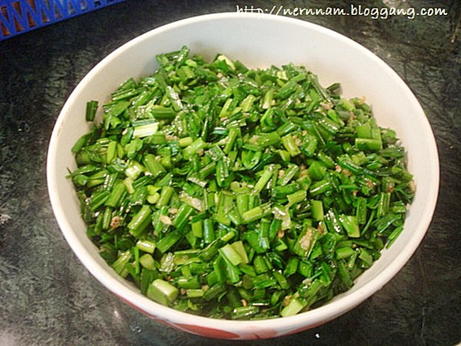 เจียวกระเทียมให้เหลือง ใส่ใบกุยช่ายผสม เบกิ้งโซดา ซีอิ๊วขาว เกลือ น้ำตาล ลงผัดพอสุก