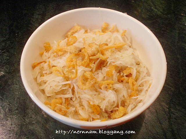 - กุ้งแห้งแช่น้ำให้นิ่มและนำขึ้นสะเด็ดน้ำ