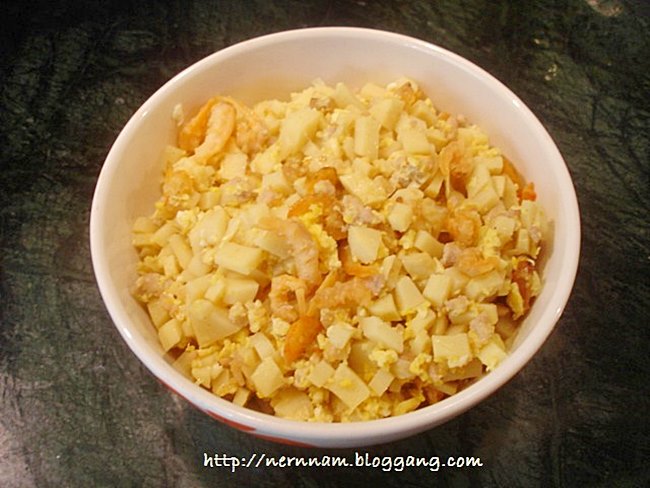เจียวกระเทียมให้เหลือง ใส่หัวไชเท้าขูดฝอยลงไปผัดให้สุก ตามด้วยกุ้งแห้ง ปรุงรสด้วยซีอิ๊วขาว เกลือ น้ำตาล พริกไทย