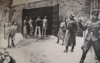 รูปซ้าย เป็นภาพวาด ผนังแห่งความตาย เมื่อเหยื่อถูกยิงทิ้ง เหล่าเชลยจะยกศพไปวางกองกันไว้