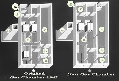 รูปซ้าย คือพื้นที่ที่เหล่าเหยื่อชาวยิว จะถูกส่งเข้าเพื่อเป็นที่ตาย โดยการรมด้วยแก๊สพิษ