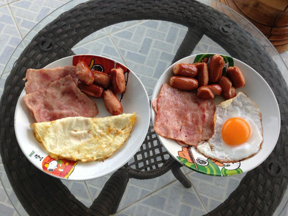 เริ่มมื้อเช้า เป็นมื้อชงัดนัก จัดไปด้วยอเมริกันเบรคฟาส คอลเลสเตอรอลเต็มพิกัด เท็คนิค ทอดแฮมจะให้หอมเค็มพอดี ต้องทอดด้วยเนยสด ส่วนไข่ดาวใครชอบยางมะตูม ให้ใช้กระทะเทฟล่อนใส่น้ำมันเล็กน้อย ไฟอ่อนสุดๆนะจ้ะ
