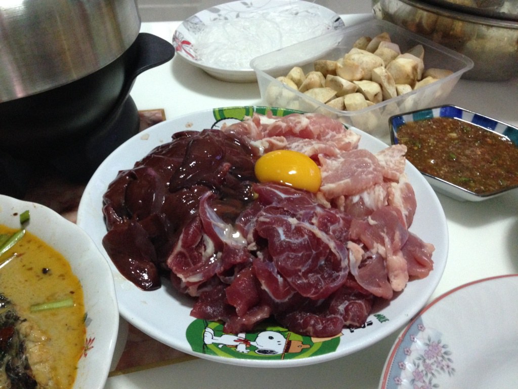 อันนี้จิ้มจุ่มแซบ ใช้ตะไคร้หัวหอมพริก ข่า และมะขามเปียก ปั่นรวมกันเพื่อความเข้มข้น เติมน้ำซุปไก่ปรุงรส ต้มเสร็จซดได้เลย มีน้ำจิ้มแจ่วไว้จิ้มเนื้อโคขุนลวก ดูสิ มันจะอยู่ได้อีกี่ปี