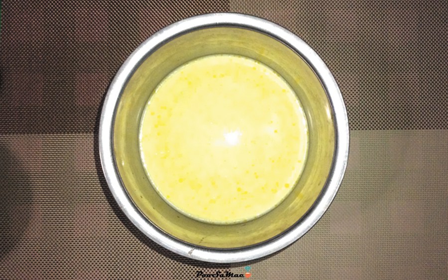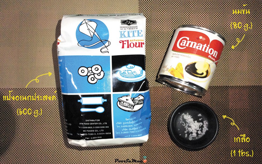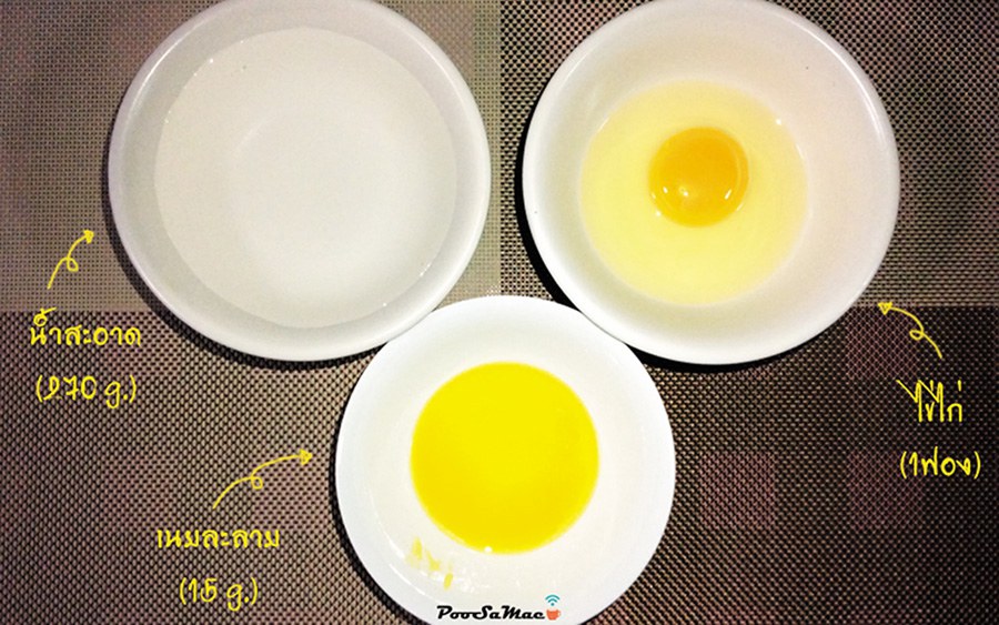 1. ผสมเนยละลาย ไข่ไก่ น้ำ นมข้น เกลือ เข้าด้วยกัน