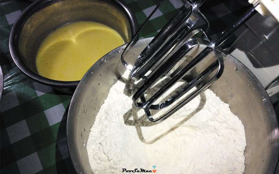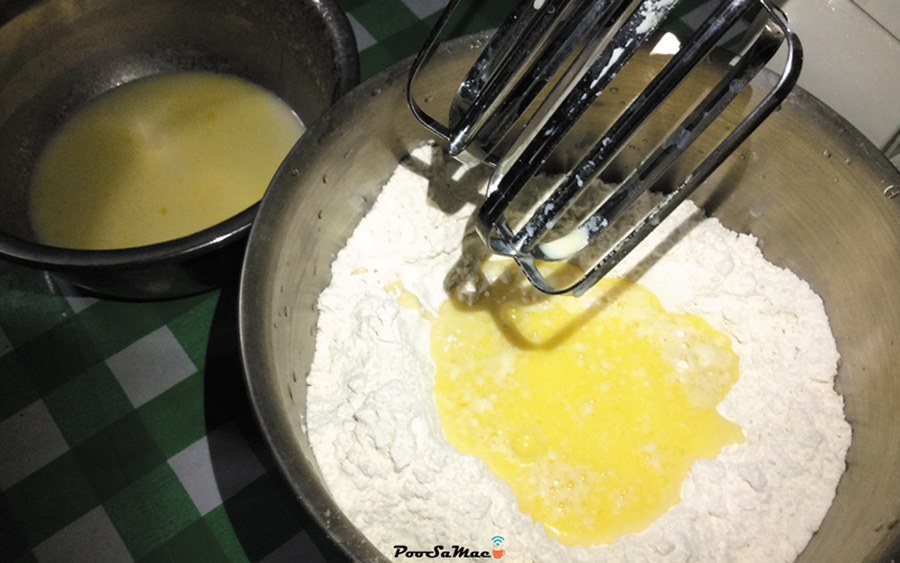 3.ทำหลุมตรงกลาง ค่อยๆใส่ของเหลวลงไปปั่นส่วนผสมด้วยความเร็ว1
