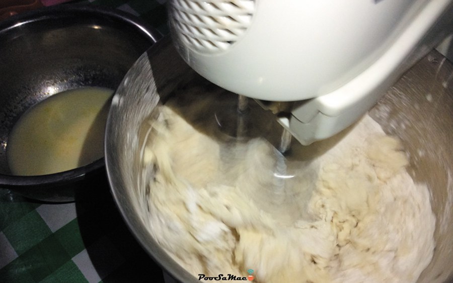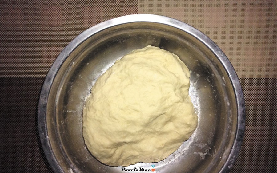 แป้งเหนียวมาก เครื่องปั่นกำลังน้อยปั่นไม่ไหว เอาออกมานวดมือต่อ.. นวดให้ได้แป้งเนียนๆ