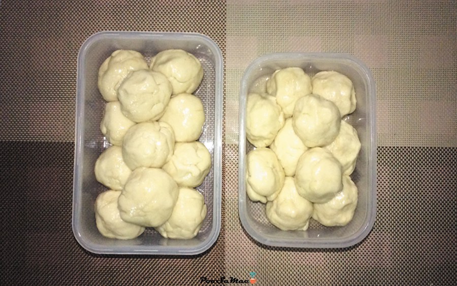 5.แบ่งแป้งเป็นก้อนๆ เราแบ่งได้ 21 ก้อน (ไม่ได้ชั่งนะ กะๆเอา) ชุบด้วยน้ำมัน หรือเนยละลาย และเก็บใส่กล่องปิดฝาแช่ตู้เย็นไว้ข้ามคืน